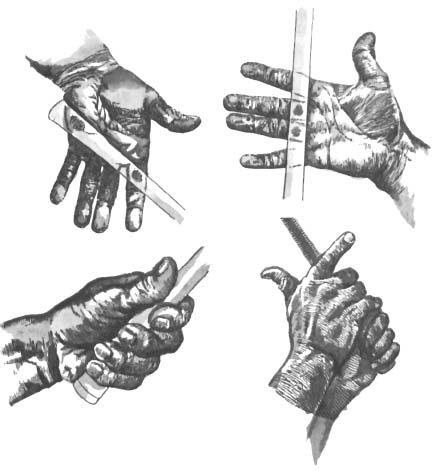 把杆子从食指靠掌的第一个指节斜着横贯上去,紧紧的靠着掌缘下端的厚肉垫。吃力点只在最后的三只手指上跟掌缘底端 的肉垫。大拇指跟食指之间的V形纹要指着右眼。 |